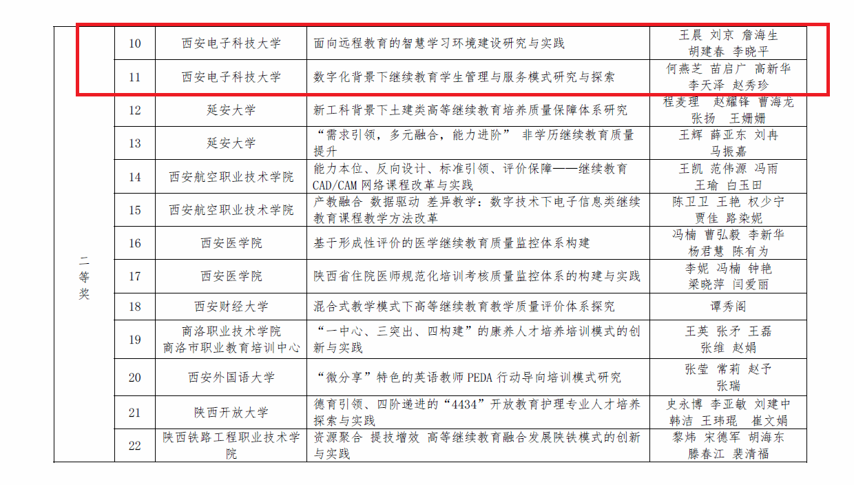 本次陕西省高等继续公司产品成果奖和优秀教师评选工作,由陕西省高等继续教育学会组织,经各会员单位公开征集、初评推荐,学会组织专家材料审核、现场评审确定,共评审出22项优秀教学成果,20名优秀教师。