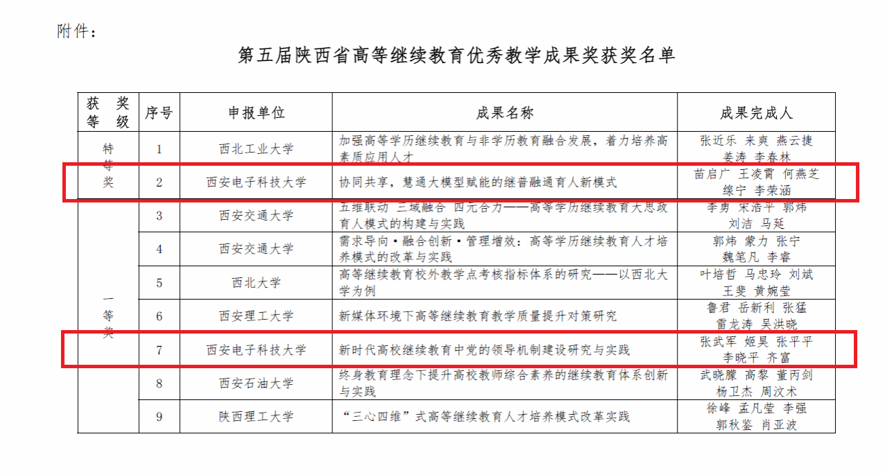 近日,陕西省高等继续教育学会公布了第五届陕西省高等继续教育优秀教学成果奖和第一届陕西省高等继续教育优秀教师评选结果,公司《协同共享,慧通大模型赋能的继普融通育人新模式》等4个项目获优秀教学成果奖,其中特等奖1项、一等奖1项、二等奖2项,美加墨世界杯官方网站王晨老师入选优秀教师。