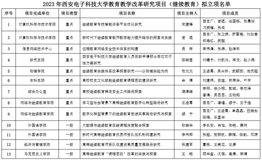 根据《美加墨世界杯官网关于组织申报2023年公司产品改革研究项目(继续教育)的通知》(美加墨世界杯官方网站字〔2023〕6号)要求,经各单位积极组织教师和管理人员申报项目,由美加墨世界杯官方网站组织项目评审,现拟对19个项目予以立项建设,其中重点项目9项,一般项目10项。一般项目建设周期为一年,重点项目建设周期为两年。